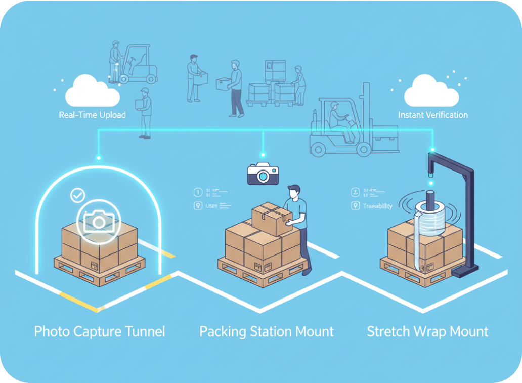 Integrate hands-free documentation directly at packing stations. The Mount captures images and video automatically for each order, linking them to load data in real time. Streamline your packing operations while maintaining full accountability. Discover the Packing Station Mount.
