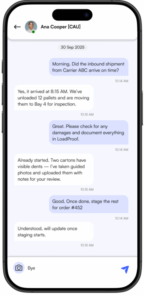 Team members can chat instantly while staying inside the LoadProof workflow, whether capturing photos, reviewing documentation, or handling exceptions. No context-switching means warehouse staff, supervisors, and logistics coordinators can share insights and updates on the spot, minimizing delays and addressing problems in real time.